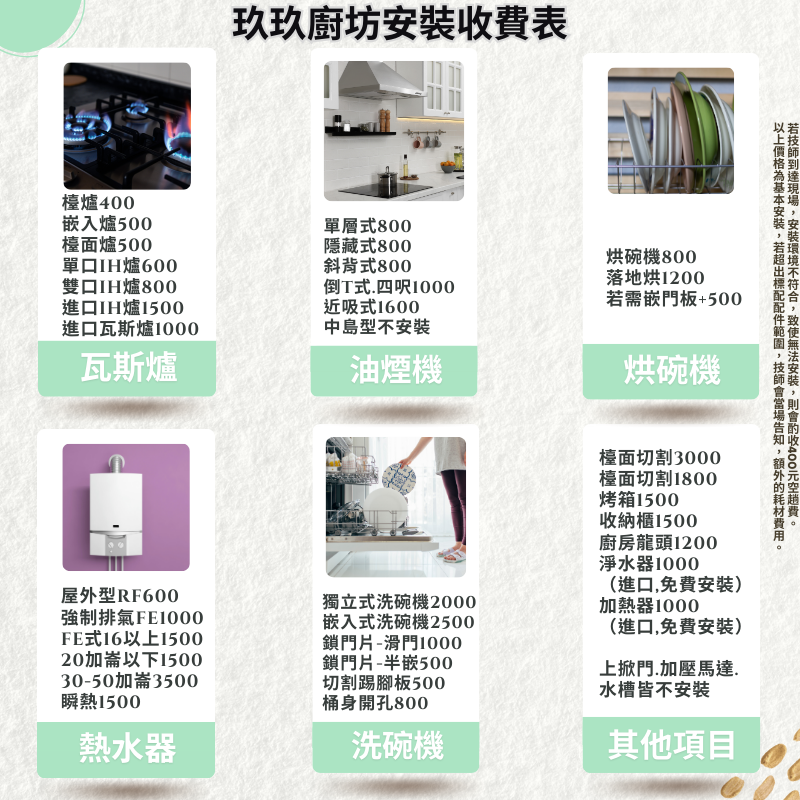 ❏基本安裝以原廠包裝內容、配件、零件,在不變更安裝環境(如拉電、更改插座、管線延長、修改櫥櫃、嵌門板等)的前提下完成安裝,超出基本安裝範圍會另酌收施工費用,費用依師傅現場評估為準,請於安裝完成當日支付給師傅 。